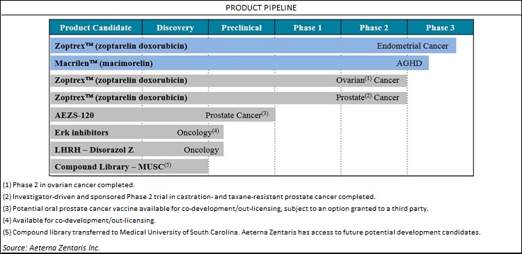 As the first intravenous drug in a clinical study to direct a chemotherapy agent specifically to luteinizing hormone-releasing hormone (LHRH)-receptor expressing tumors, Zoptrex™ is believed to lead to a more targeted treatment with less damage to healthy tissue and reduced side effects. Its most advanced indication is for advanced, recurrent, or metastatic endometrial cancer (noting that endometrial cancer is the most common of the gynecologic malignancies and was estimated to affect 1 in 37 women during 2015). If Zoptrex™ is approved for its first indication, Aeterna intends to develop the compound for other tumors also expressing the LHRH-receptor, such as ovarian, prostate, and possibly additional cancer indications as part of the product’s lifecycle management program. A Phase 2 trial in ovarian cancer has been successfully completed and published, while an investigator-initiated Phase 2 trial in prostate cancer has also recently met its primary endpoint.